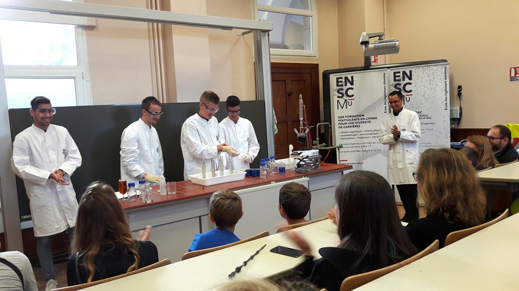 Samedi 29 septembre quatre étudiants et un enseignant-chercheur de l’ENSCMu ont donné cinq représentation d’un petit spectacle de chimie magique au Collège Épiscopal de Zillisheim dans le cadre du Festival de Magie organisé par le Rotary Club Mulhouse-Collines et l’Amicale des anciens du Collège.